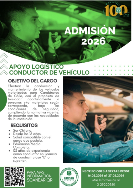 Carabineros de Chile abrió proceso Nacional de postulaciones para cargos de Apoyos Logísticos, los cuales son para formar parte de la Planta Institucional en diversas áreas tales como: Auxiliar de Almacén, Conductores de Vehículos, Garzón, Mantención de Cuarteles, Mecánico Automotriz y Rancheros; todos ellos ya disponibles para concursar a través de la plataforma postulaciones.carabineros.cl.